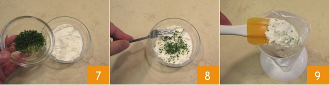 In die Schüssel mit dem Ziegenkäse fügen Sie den Schnittlauch hinzu (behalten Sie einige Teelöffel für die finale Dekoration zurück) 7 und vermischen Sie ihn mit einer Gabel 8. Geben Sie dann die Creme in einen Spritzbeutel mit Sterntülle 9 und legen Sie ihn beiseite.