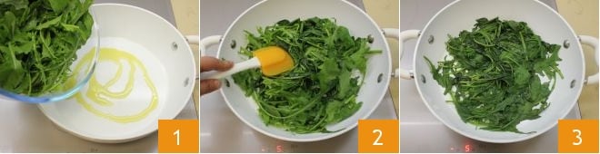 Um die Enkir-Törtchen mit Kartoffeln und Chicorée zuzubereiten, beginnen Sie mit dem Mürbeteig aus Enkir-Mehl und wildem Chicorée. Zuerst den wilden Chicorée in einer Pfanne mit etwas Öl 1 für ein paar Minuten unter gelegentlichem Rühren 2 kochen, bis er welk ist, aber nicht völlig trocken 3. Dann vollständig abkühlen lassen.