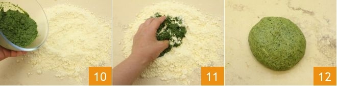 Dann die sandige Mischung auf eine Arbeitsfläche geben und die Chicorée-Creme hinzufügen 10. Mit den Händen anfangen zu kneten 11, bis ein glatter und kompakter Teig entsteht 12. In Frischhaltefolie wickeln und im Kühlschrank etwa 30 Minuten fest werden lassen.
