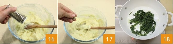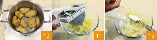 In der Zwischenzeit die Füllung für die Enkir-Törtchen zubereiten. Die Kartoffeln in reichlich Wasser kochen 13, schälen und noch warm in einer Schüssel zerdrücken 14. Die leicht erwärmte Milch langsam hinzufügen 15 und mit einem Holzlöffel vermischen, bis eine glatte Masse entsteht.