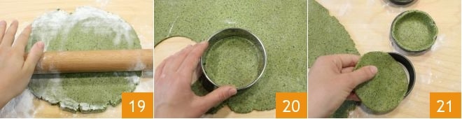 Nach den 30 Minuten den Mürbeteig bis auf eine Dicke von etwa 2-3 mm ausrollen 19. Mit einem Ausstecher Kreise mit einem Durchmesser von 11 cm ausschneiden 20. Eine Törtchenform (mit einem Durchmesser von 8,5 cm) nehmen und mit den gerade ausgeschnittenen Kreisen auslegen 21.