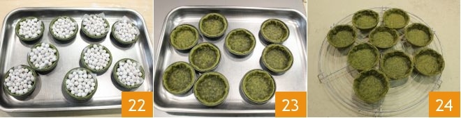 Ein Quadrat Backpapier auf die Törtchen legen und mit Keramikkugeln zum Blindbacken bedecken 22. Die Törtchenböden im vorgeheizten statischen Ofen bei 180°C für 25 Minuten backen (im Umluftofen bei 160°C für 15-20 Minuten). Nach dieser Zeit die Keramikkugeln entfernen 23 und das Backen für etwa zehn Minuten fortsetzen. Sobald sie gebacken sind, die Törtchenböden herausnehmen und auf einem Gitter abkühlen lassen 24.