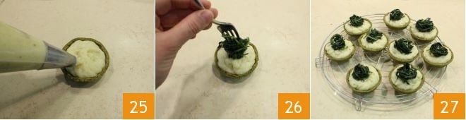Nun ist alles bereit! Jetzt müssen Sie nur noch Ihre Enkir-Törtchen mit Kartoffeln und wildem Chicorée zusammenstellen. Jeden Boden mit der Kartoffel-Fenchelsamen-Creme füllen, indem Sie konzentrische Kreise machen, um eine gleichmäßige Füllung zu erhalten 25. Schließlich mit einer Gabel etwas Chicorée aufnehmen, als wären es Spaghetti, und in der Mitte des Törtchens wie ein Nest platzieren 26. Die Törtchen mit ein paar Fenchelsamen vollenden und servieren 27.
