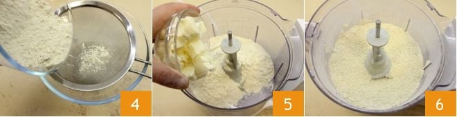 In der Zwischenzeit das Enkir-Mehl 4 sieben und in eine Küchenmaschine geben, zusammen mit der in Stücke geschnittenen kalten Butter 5 und einer Prise Salz. Die Küchenmaschine einschalten und alles gut vermengen, die Mischung sollte nicht zusammenhalten, sondern eine körnige Konsistenz haben, als wäre es Sand 6.