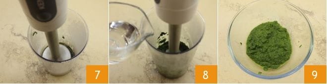 Nun den wilden Chicorée mit einem Stabmixer pürieren 7 und langsam Wasser hinzufügen 8, bis eine sehr feine und flüssige Creme entsteht 9.