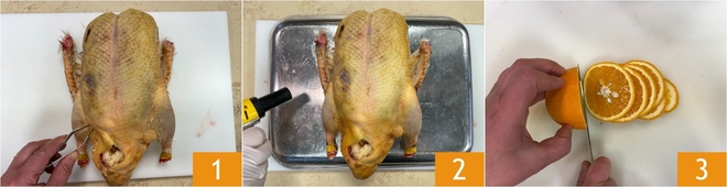 Um die Ente mit Orange zuzubereiten, kontrollieren Sie zuerst, ob noch Federn übrig sind, und entfernen Sie diese gegebenenfalls mit einem kleinen Messer 1, dann überflammen Sie sie mit einem Bunsenbrenner 2. Schneiden Sie aus einer Orange 5 dünne Scheiben mit Schale heraus 3.