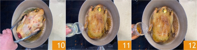 Braten Sie die Ente von allen Seiten bei mittlerer Hitze an 10, bis sie goldbraun ist. Löschen Sie mit dem Weißwein ab 11 und lassen Sie ihn verdampfen. Dann geben Sie auch den Orangenlikör hinzu 12.