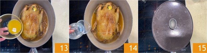 Vervollständigen Sie mit dem Orangensaft 13 und dem Wasser 14. Decken Sie mit einem Deckel ab und setzen Sie den Garvorgang im vorgeheizten statischen Ofen bei 200°C für 90 Minuten fort 15.