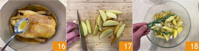 Nehmen Sie die Ente alle 20 Minuten aus dem Ofen und begießen Sie die Oberfläche mit dem Bratensaft 16. Während das Fleisch gart, kümmern Sie sich um die Kartoffeln: Nach gründlichem Waschen, schneiden Sie sie in Spalten, ohne sie zu schälen 17. Geben Sie die Kartoffeln in eine Schüssel und würzen Sie sie mit Salz, Pfeffer, Öl, Rosmarin und Knoblauch 18.