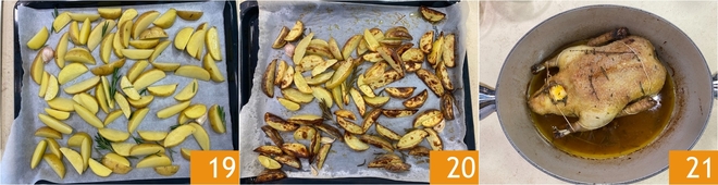 Mischen Sie, um den Geschmack zu verteilen, und verteilen Sie dann die Kartoffeln auf einem mit Backpapier ausgelegten Backblech 19 und backen Sie sie zusammen mit der Ente für etwa 30 Minuten oder bis sie goldbraun sind 20. Wenn die Ente gar ist, nehmen Sie sie aus dem Ofen 21 und halten Sie sie zusammen mit den Kartoffeln unter Alufolie warm.