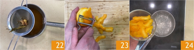 Filtern Sie den Bratensaft und stellen Sie ihn beiseite 22. Für die Orangensoße: Mit einem Sparschäler die Schale der Orange abziehen 23, dabei darauf achten, nicht den weißen Teil zu erwischen, der bitter wäre. Blanchieren Sie die Schalen in Wasser 24.