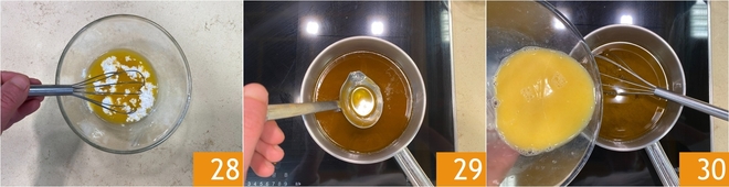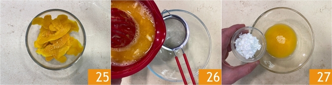 Abgießen und die Schalen in einer Schüssel abkühlen lassen 25. Pressen und sieben Sie den Orangensaft 26 und sammeln Sie ihn in einer Schüssel, dann fügen Sie die Maisstärke hinzu 27.