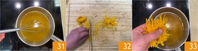Bringen Sie die Soße zum Kochen, damit sie eindickt 31. In der Zwischenzeit die blanchierten Schalen in Streifen schneiden 32. Sobald die Soße eingedickt ist, nehmen Sie sie vom Feuer und fügen Sie die Schalenstreifen hinzu 33.