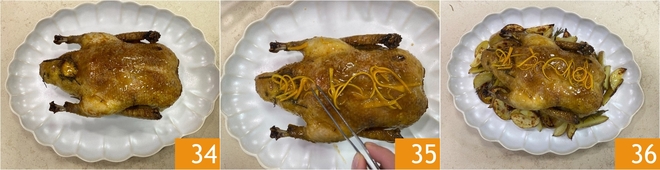 Servieren Sie die Ente mit Orange 34, übergossen mit der Soße 35 und begleitet von den Ofenkartoffeln 36.