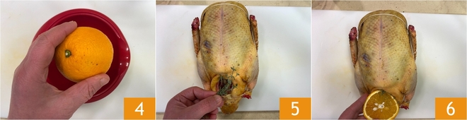 Pressen Sie 50 g Orangensaft aus 4 und stellen Sie ihn beiseite. Füllen Sie nun die Ente mit den Rosmarinzweigen, dem Thymian 5 und den Orangenscheiben 6.