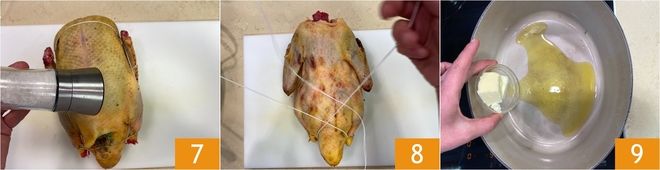 Salzen 7 und pfeffern Sie die Oberfläche, dann binden Sie die Ente: Führen Sie die Schnur unter dem Schwanz durch und kreuzen Sie sie, dann führen Sie sie hinter den Schenkeln entlang und ziehen Sie sie fest, dann führen Sie sie unter die Flügel. Drehen Sie die Ente um und machen Sie auch auf der Unterseite einen Knoten. Führen Sie die Schnur erneut auf der oberen Seite entlang und binden Sie sie am Hals 8. In einem gusseisernen Topf das Öl und die Butter erhitzen 9.