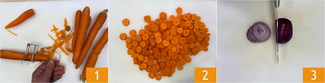 Um das Erbsen-Karotten-Omelett zuzubereiten, schälen Sie die Karotten 1 und schneiden Sie sie in Scheiben von 4-5 mm Dicke 2. Schälen und schneiden Sie die Zwiebeln 3.