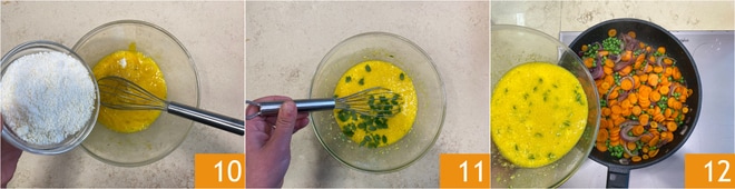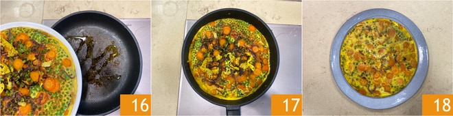 Drehen Sie die Pfanne mit einem entschlossenen und schnellen Bewegungsablauf um und lassen Sie das umgedrehte Omelett in die Pfanne gleiten 16. Kochen Sie auch die andere Seite für etwa 5-8 Minuten 17. Das Erbsen-Karotten-Omelett ist bereit 18.