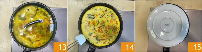 Decken Sie mit einem Deckel ab 13. Reduzieren Sie die Hitze und kochen Sie das Omelett etwa 10 Minuten. Wenn die Oberfläche leicht fest, aber noch feucht ist 14, wenden Sie das Omelett mit Hilfe eines flachen Tellers 15.