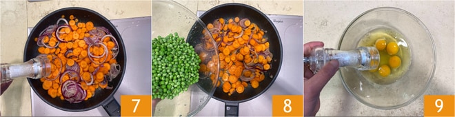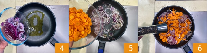 Gießen Sie nun in eine Pfanne von 28 cm Durchmesser (oben gemessen, 24 cm der Boden) einen Schuss Öl und die Zwiebeln 4. Schmoren Sie diese bei niedriger Hitze für 5 Minuten. Nach 5 Minuten geben Sie die Karotten hinzu 6 und kochen Sie alles etwa 10 Minuten lang bei niedriger Hitze. Pfeffern 6
