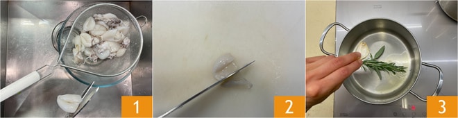 Um das Erbsen- und Tintenfischchenrisotto zuzubereiten, reinigen Sie die Tintenfische, trennen Sie die Tentakel vom Kopf 1, entfernen Sie den Teil mit Schnabel und Augen, schneiden Sie die Köpfe in Hälften, um eine kleinere Größe zu erhalten 2. Geben Sie etwas Öl in eine Pfanne, eine zerdrückte Knoblauchzehe, die Rosmarinzweige und den Salbei hinzu 3.