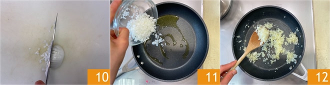 Die zwei Zwiebeln hacken 10, in einer Pfanne mit wenig Öl und Salz anschmoren 11, die Hälfte der gehackten Zwiebel entfernen 12.