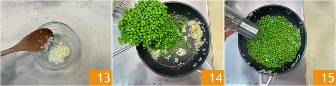 Beiseite stellen 13. In die Pfanne mit der restlichen Zwiebel die Erbsen geben 14, salzen und pfeffern 15, alles zusammen etwa 5-8 Minuten anbraten, um die Erbsen zu garen.