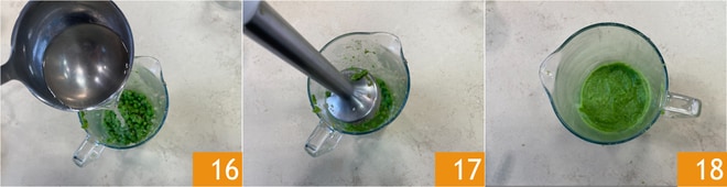 Die Erbsen in einen Krug geben 16, eine Kelle heiße Brühe hinzufügen 17 und mit dem Stabmixer zu einer Creme pürieren 18.