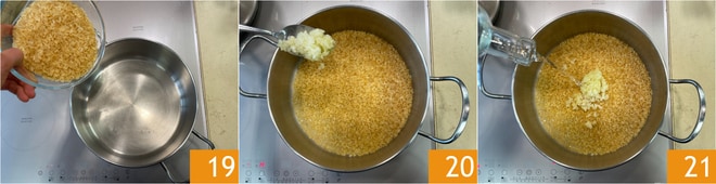 Den Reis in einen gut erhitzten Topf geben 19, rühren, bis das Korn sehr heiß ist, die beiseitegestellte angeschmorte Zwiebel hinzufügen 20, mit dem restlichen Weißwein ablöschen 21.