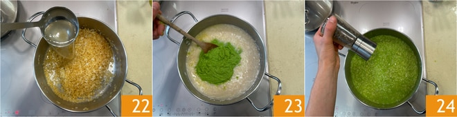Nach und nach etwas heiße Brühe hinzufügen 22, salzen und bis zur gewünschten Konsistenz kochen, dabei bei Bedarf Brühe zufügen. Kurz vor Ende der Garzeit die Erbsencreme einarbeiten 23, mit Pfeffer abschmecken 24.