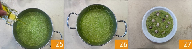 Vom Herd nehmen und das Risotto mit Öl mischen 25 und rühren 26. Das Risotto mit den in der Pfanne gekochten Tintenfischchen servieren und sofort servieren 27.