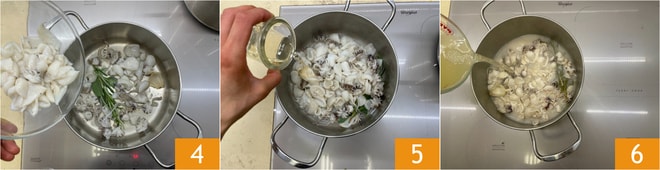 Geben Sie die Tintenfischchen hinzu 4, braten Sie sie zwei Minuten an, löschen Sie mit 40 g Weißwein ab 5, fügen Sie etwas Brühe hinzu 6.