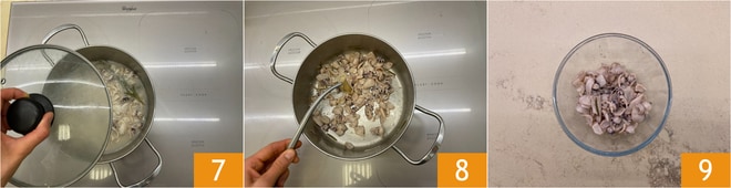 Köcheln Sie auf niedriger Flamme mit geschlossenem Deckel für etwa 40 Minuten 7. Fügen Sie bei Bedarf Gemüsebrühe hinzu. Am Ende der Garzeit den Deckel abnehmen, die Flüssigkeit eindicken lassen (falls noch vorhanden), salzen, Knoblauch, Rosmarin und Salbei entfernen 8 und warm halten 9.