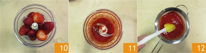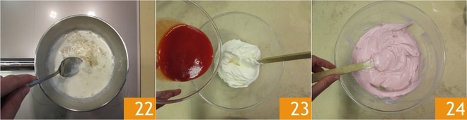 Mischen Sie mit einem Löffel oder einem Schneebesen 22, bis sie sich vollständig aufgelöst hat. Lassen Sie sie abkühlen und geben Sie in der Zwischenzeit die Erdbeersauce in die Käsecreme 23. Mischen Sie mit einem Spatel, bis eine gleichmäßige Farbe erreicht ist.