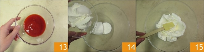 Stellen Sie Ihre Erdbeersauce beiseite 13. Geben Sie die Ricotta und den Mascarpone in eine Schüssel 14 und mischen Sie sie mit einem Spatel, um sie weich zu machen.