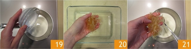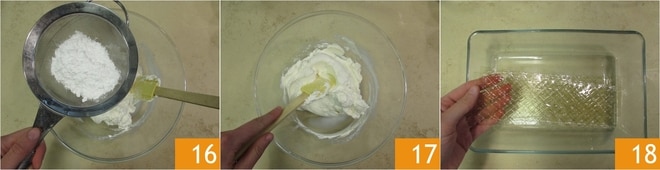 Sieben Sie nach und nach den Puderzucker in die Käsemischung 16 und mischen Sie, bis er vollständig aufgenommen ist 17. Weichen Sie die Gelatine in kaltem Wasser ein 18 und warten Sie ein paar Minuten.