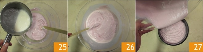 Geben Sie nun die abgekühlte Mischung aus Sahne und Gelatine hinzu 25 und mischen Sie gut, um sie mit den restlichen Zutaten zu kombinieren 26. Nehmen Sie den Boden aus dem Kühlschrank und geben Sie die Mischung darauf 27.