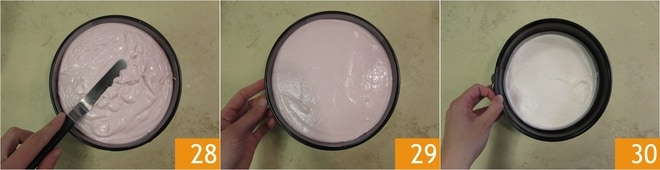 Verwenden Sie einen Spatel 28, um die Oberfläche gut zu glätten 29. Stellen Sie die Torte für mindestens 2 Stunden in den Kühlschrank, damit die Mischung fest wird. Beim Servieren nehmen Sie den Käsekuchen aus dem Kühlschrank und erweitern Sie den Ring, um ihn zu entfernen 30.