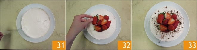 Legen Sie ihn auf einen Servierteller und entfernen Sie das Azetat an den Rändern 31. Dekorieren Sie mit frischen Erdbeeren 32 und zerbröselten Keksen 33. Der Erdbeer-Käsekuchen ist servierfertig.