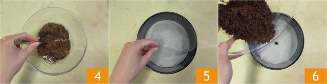 Gut mischen 4, bis eine homogene Masse entsteht. Jetzt legen Sie den Boden einer 20 cm Springform mit Backpapier aus und die Ränder mit einem Streifen aus Azetatfolie 5. Wenn Sie kein Azetat haben, können Sie auch in diesem Fall Backpapier verwenden. Geben Sie die Keksmasse hinein 6.