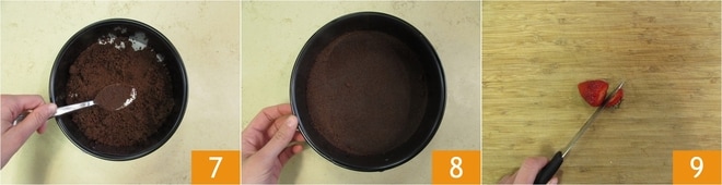 Drücken Sie die Masse gut mit der Rückseite eines Löffels fest 7, um eine gleichmäßige Dicke zu erzielen 8. Stellen Sie den Boden für mindestens eine Stunde in den Kühlschrank. In der Zwischenzeit kümmern Sie sich um die Creme: Waschen Sie die Erdbeeren und entfernen Sie den Teil mit den Blättern 9.