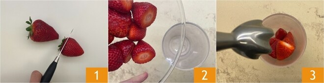 Um die Erdbeer-Madeleines zuzubereiten, waschen Sie zunächst die Erdbeeren und entfernen den Strunk 1, dann geben Sie sie in einen Messbecher 2 und pürieren sie mit einem Stabmixer 3.