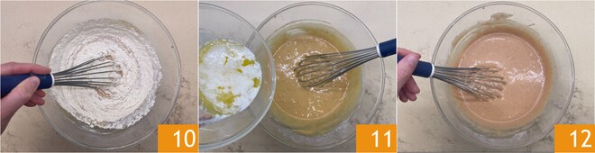 Arbeiten Sie die trockenen Zutaten mit dem Schneebesen ein 10, dann fügen Sie die geschmolzene Butter 11 hinzu und mischen alles gut 12. Decken Sie die Schüssel mit Frischhaltefolie ab und lassen Sie den Teig 30 Minuten im Kühlschrank ruhen.