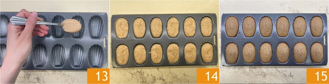 Nach dieser Zeit fetten Sie die Madeleine-Form ein und füllen jede Vertiefung mit einem kleinen Löffel Teig 13. Backen Sie die Madeleines im vorgeheizten statischen Ofen bei 200°C für etwa 12 Minuten 14. Sobald sie fertig sind, nehmen Sie die Form aus dem Ofen 15.