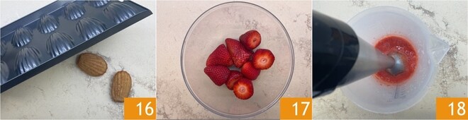 Nehmen Sie die Madeleines noch warm aus der Form, indem Sie leicht darauf klopfen 16, dann lassen Sie sie abkühlen. In der Zwischenzeit kümmern Sie sich um die Glasur: Schneiden Sie die Erdbeeren zu 17 und pürieren sie mit dem Stabmixer 18.