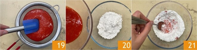 Seihen Sie das Püree mit einem Sieb ab, um es glatt und homogen zu machen 19, dann fügen Sie es zum Puderzucker hinzu 20 und mischen alles 21.
