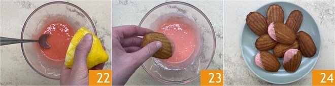 Zum Schluss fügen Sie den Zitronensaft hinzu 22 und rühren nochmals um. Tauchen Sie ein Ende der Madeleines in die Glasur 23 und lassen Sie sie bei Raumtemperatur trocknen. Ihre Erdbeer-Madeleines sind servierbereit 24!