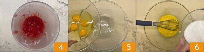 Nachdem Sie das Erdbeerpüree zubereitet haben 4, schmelzen Sie die Butter in einem kleinen Topf und lassen sie abkühlen. In einer separaten Schüssel geben Sie die Eier 5 hinzu und schlagen sie mit dem Zucker, ohne sie aufzuschlagen 6.