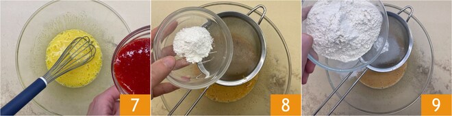 Fügen Sie das Erdbeerpüree 7 hinzu und mischen Sie die Masse mit einem Schneebesen. Sieben Sie das Backpulver 8 und das Mehl 9 in die Schüssel.