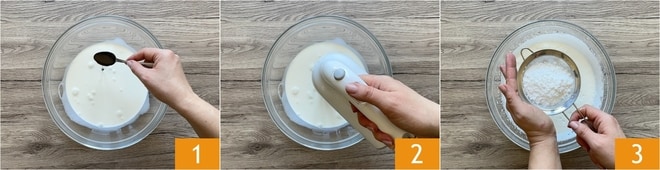 Um das Erdbeermillefeuille zuzubereiten, gießen Sie zuerst die Sahne in eine Schüssel und fügen Sie das Vanilleextrakt hinzu 1. Beginnen Sie mit dem elektrischen Handmixer zu schlagen 2 und sobald die Mischung anfängt, dick zu werden, sieben Sie den Puderzucker hinzu 3.